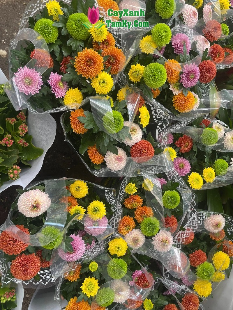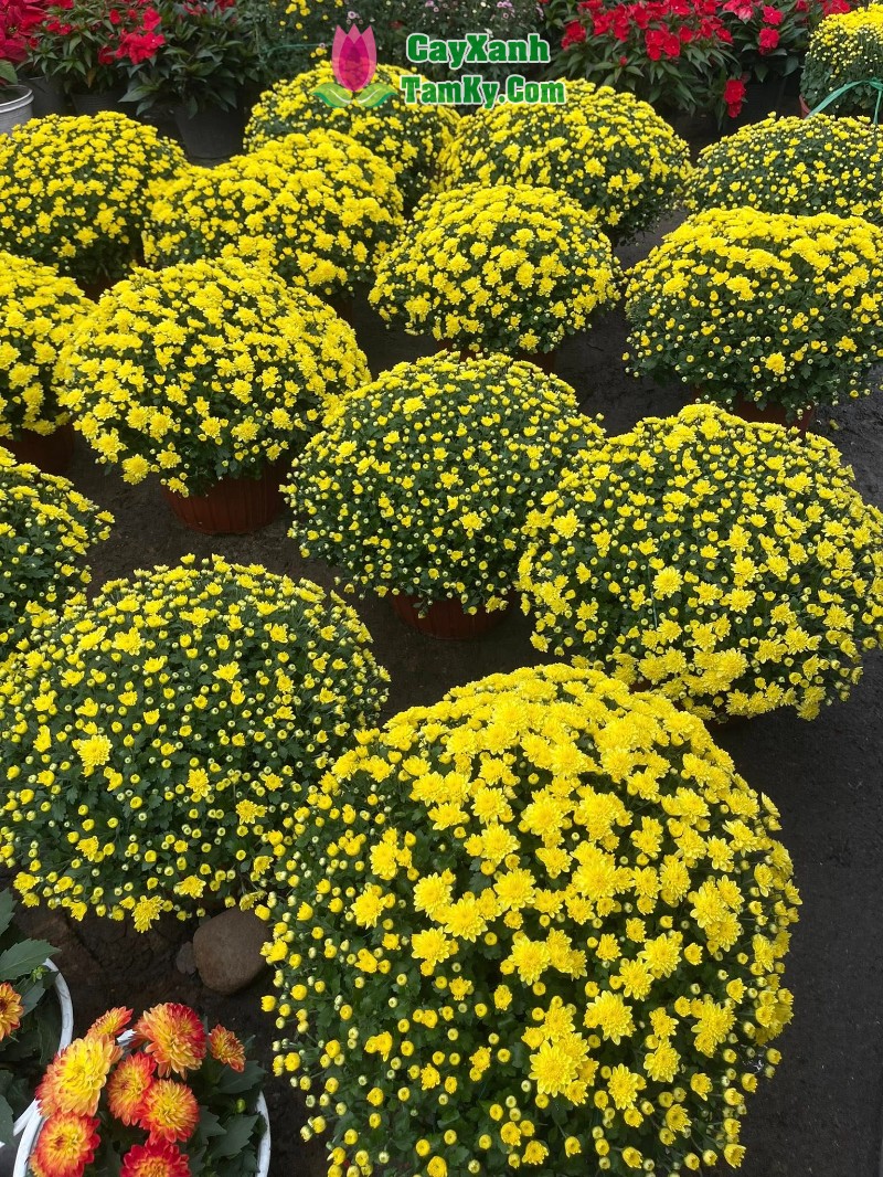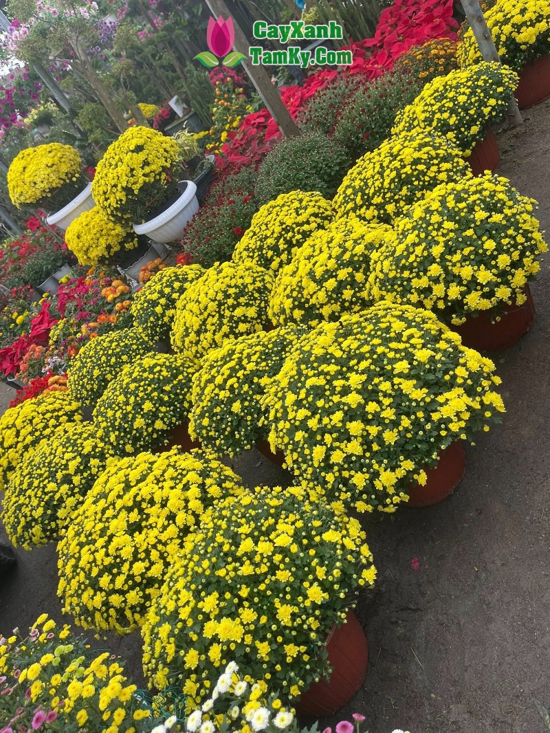 Nổi bật là những chậu cúc Hàn hoa nở đều, bền màu, mang vẻ đẹp nhẹ nhàng nhưng rất sang, được nhiều gia đình chọn chưng phòng khách, hiên nhà. Kế bên là khu cúc mâm xôi vàng rực, tròn đầy, tượng trưng cho sự sung túc, viên mãn – một trong những dòng hoa được săn đón nhiều nhất mỗi mùa Tết.
